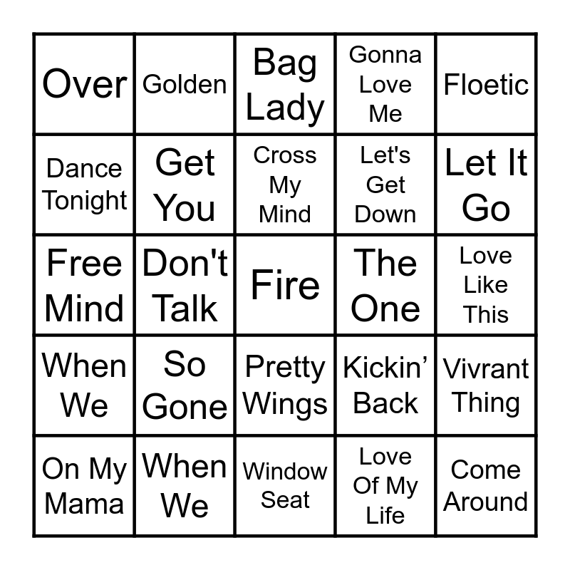 This bingo card has 75 words: All I Want Is You, ALL MINE, Bag Lady, Be Your Girl, Better, Bonita Applebum, Brown Skin, Buddy, Butta Love, Can't Get Enough, Come Around, Come Close, Cross My Mind, Dance Tonight, D'Evils, Don't Talk, Exchange, Fire, Fire We Make, Floetic, Fortunate, Free Mind, Get You, Golden, Gonna Love Me, Good Good, Heard It All Before, Holding You Down, I Hate U, I Wanna Be Down, If I Ruled the World, It's a Party, Just in Case, Kickin’ Back, Let It Go, Let's Get Down, Lost Ones, Lotus Flower Bomb, Love Like This, Love Of My Life, Love That Girl, Ms. Fat Booty, Need U Bad, Next Lifetime, Nights Like This, On Chill, On My Mama, Over, People, Permission, Pressure, Pretty Wings, Put That Woman First, Real Love, Roll Some Mo, Say Yes, Sending My Love, Slide, Smokin Out The Window, Snooze, So Gone, Sweet Thing, Take A Message, Take Off The Blues, The Light, The One, This Luv, Un-thinkable, V.S.O.P., Vivrant Thing, When We, When We, Where I Wanna Be, Window Seat and You.