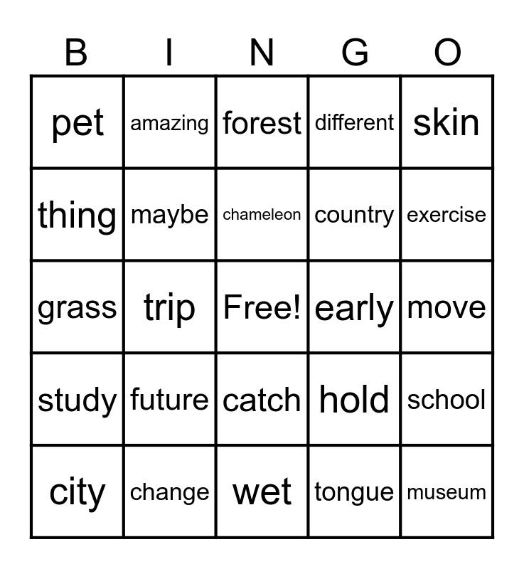 This bingo card has a free space and 26 words: catch, tongue, chameleon, change, skin, pet, thing, amazing, move, hold, country, grass, school, city, trip, timetable, different, study, forest, museum, exercise, wet, early, future, maybe and early.