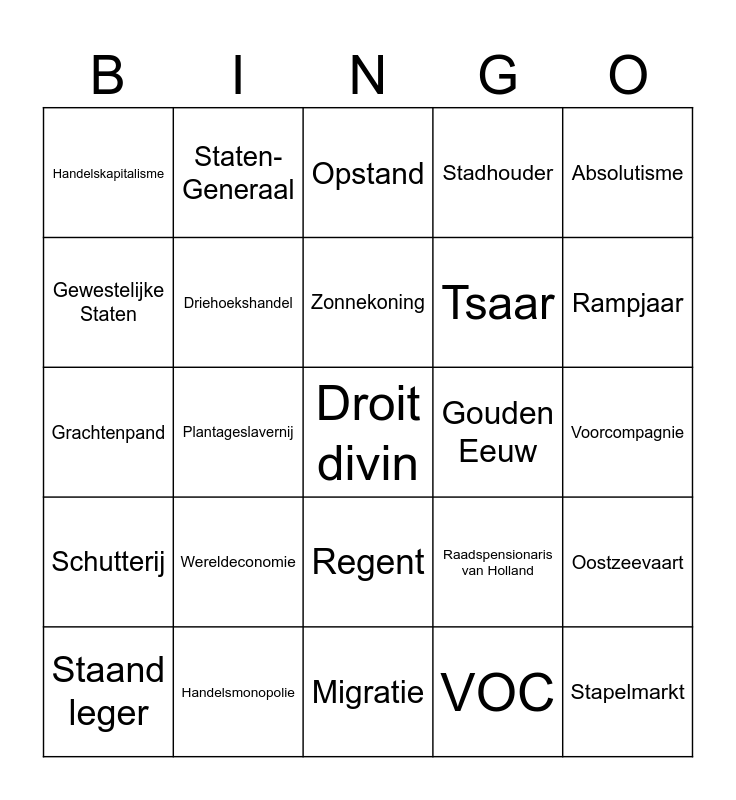 This bingo card has a free space and 30 words: Handelsmonopolie, Republiek, Plantageslavernij, Verdraagzaamheid, Handelskapitalisme, Opstand, Driehoekshandel, Regent, Gouden Eeuw, Migratie, Voorcompagnie, Stapelmarkt, VOC, Wetenschappelijke Revolutie, Rampjaar, Gewest, Raadspensionaris van Holland, Schutterij, Wereldeconomie, Absolutisme, Grachtenpand, Huurlingenleger, Staten-Generaal, Tsaar, Gewestelijke Staten, Stadhouder, Oostzeevaart, Staand leger, Zonnekoning and WIC.