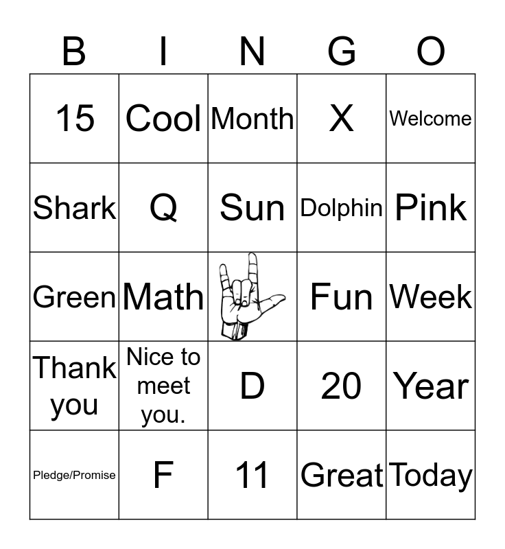 This bingo card has a free space and 24 words: Nice to meet you., F, Sun, Pledge/Promise, Welcome, 15, Shark, Cool, Fun, D, Dolphin, Green, 20, Year, Q, Great, Week, Month, Pink, Math, Today, Thank you, X and 11.