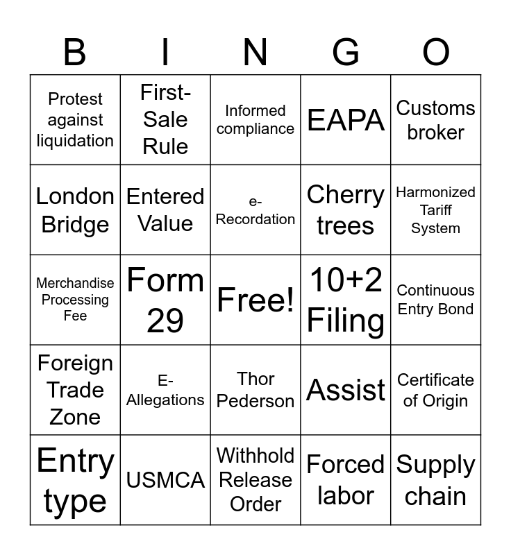 This bingo card has a free space and 75 words: Post Summary Correction, Customs audit, e-Recordation, Section 232, Country of Origin, Advisory Opinion, Incoterms, Classification Index, CBP Audit, General Rules of Interpretation, Reasonable care, Dulles Airport, Thor Pederson, Cherry trees, Regional Value Content, London Bridge, USMCA, Harbor Maintenance Fee, Transaction Value, Harmonized Tariff System, NHTSA, First-Sale Rule, Withhold Release Order, EAPA, Customs broker, Tariff engineering, 310 days, UFLPA, 7501 Entry Summary, Customs Manual, Liquidation, CIF, Ad valorem tariff, Assist, Continuous Entry Bond, Protest against liquidation, Antidumping Duties, Marking, 10+2 Filing, Supply chain, Single Entry Bond, Comply Chain, Prior Self-Disclosure, Duty drawback, Countervailing Duties, ACE, Form 29, Informed compliance, Section 337, Ultimate purchaser, The Mod Act, Entered Value, Zero penalties, Section 301, FOB, 180 days, IOR Number, Importer of record, Form 28, K-9 Teams, Entry type, Classification, Commercial invoice, Recordkeeping, Substantial transformation, Merchandise Processing Fee, Freight forwarder, Fourteen, Rubber duckies, Certificate of Origin, Foreign Trade Zone, E-Allegations, Post-entry checks, Forced labor and Dep't of Homeland Security.