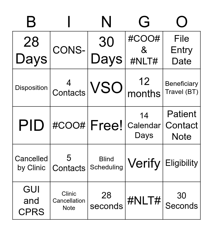 This bingo card has a free space and 29 words: GUI and CPRS, CPRS, #COO#, 20 Days, 28 Days, 30 Days, 4 Contacts, 5 Contacts, 14 Calendar Days, Clinic Cancellation Note, Patient Contact Note, 30 Seconds, 28 seconds, #NLT#, Beneficiary Travel (BT), Resource Management Grid, Blind Scheduling, Cancelled by Clinic, File Entry Date, PID, Verify, 36 months, 12 months, Disposition, #COO# & #NLT#, CONS-, Eligibility, VSO and Nurse Manager.