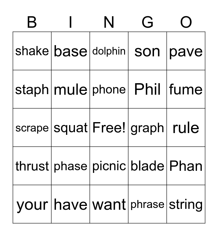 This bingo card has a free space and 24 words: phase, have, phone, your, pave, shake, staph, base, graph, picnic, Phil, scrape, blade, Phan, mule, phrase, rule, dolphin, fume, squat, string, thrust, son and want.