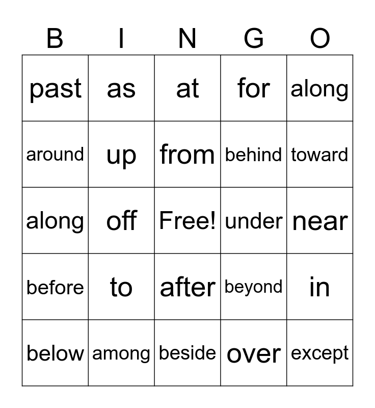 This bingo card has a free space and 24 words: to, among, from, below, along, past, around, as, under, after, behind, along, beyond, in, up, over, near, at, toward, off, except, before, for and beside.