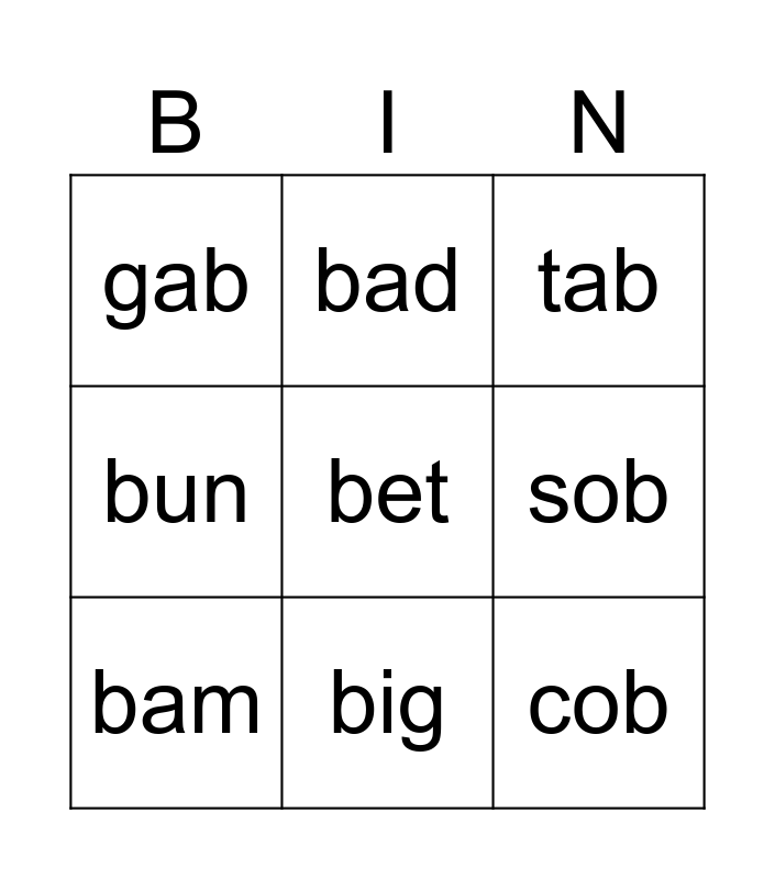 This bingo card has a free space and 8 words: sob, tab, bad, bam, gab, cob, bun and big.