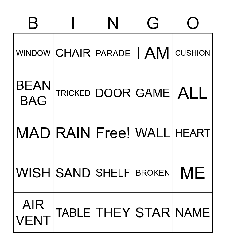 This bingo card has a free space and 24 words: SAND, TABLE, DOOR, AIR VENT, CUSHION, WINDOW, BEAN BAG, CHAIR, WALL, SHELF, GAME, MAD, BROKEN, ME, TRICKED, STAR, HEART, PARADE, ALL, RAIN, NAME, WISH, I AM and THEY.