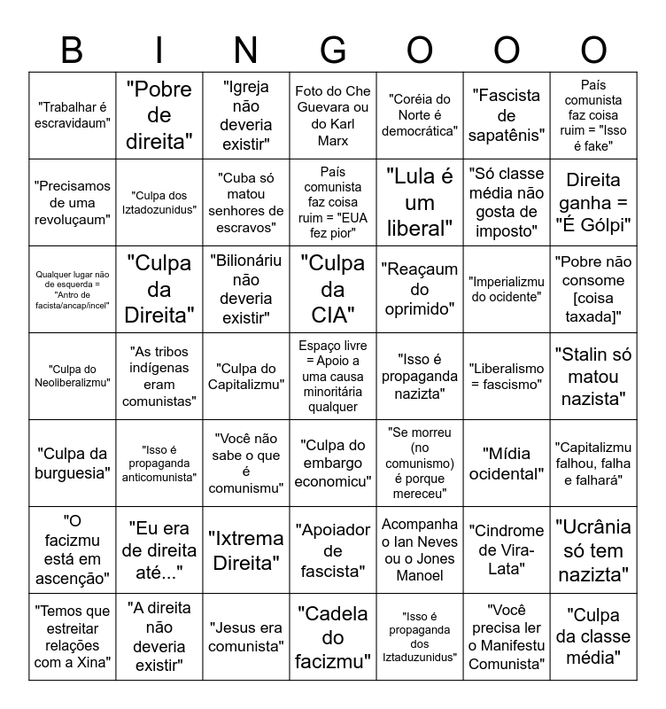 This bingo card has a free space and 48 words: Acompanha o Ian Neves ou o Jones Manoel, "Só classe média não gosta de imposto", "Cadela do facizmu", "As tribos indígenas eram comunistas", "Bilionáriu não deveria existir", "Stalin só matou nazista", "Pobre de direita", "A direita não deveria existir", "Fascista de sapatênis", "Culpa do embargo economicu", País comunista faz coisa ruim = "Isso é fake", Foto do Che Guevara ou do Karl Marx, "Imperializmu do ocidente", "Reaçaum do oprimido", "O facizmu está em ascenção", "Liberalismo = fascismo", "Precisamos de uma revoluçaum", Direita ganha = "É Gólpi", "Cindrome de Vira-Lata", "Coréia do Norte é democrática", "Lula é um liberal", "Culpa do Capitalizmu", "Trabalhar é escravidaum", "Culpa dos Iztadozunidus", "Ucrânia só tem nazizta", "Cuba só matou senhores de escravos", "Pobre não consome [coisa taxada]", "Temos que estreitar relações com a Xina", "Culpa da CIA", "Culpa da Direita", "Você precisa ler o Manifestu Comunista", "Isso é propaganda nazizta", "Capitalizmu falhou, falha e falhará", "Eu era de direita até...", "Culpa do Neoliberalizmu", "Se morreu (no comunismo) é porque mereceu", "Mídia ocidental", Qualquer lugar não de esquerda = "Antro de facista/ancap/incel", "Você não sabe o que é comunismu", "Ixtrema Direita", "Culpa da burguesia", "Culpa da classe média", "Igreja não deveria existir", "Jesus era comunista", País comunista faz coisa ruim = "EUA fez pior", "Apoiador de fascista", "Isso é propaganda anticomunista" and "Isso é propaganda dos Iztaduzunidus".