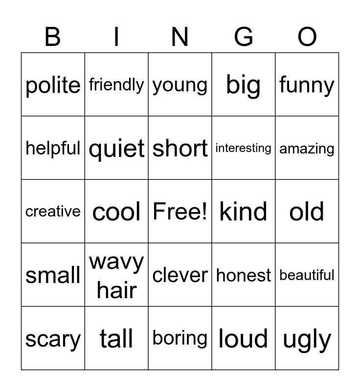 This bingo card has a free space and 24 words: wavy hair, tall, short, scary, funny, polite, helpful, friendly, kind, clever, interesting, creative, honest, beautiful, quiet, loud, old, young, amazing, cool, ugly, small, big and boring.