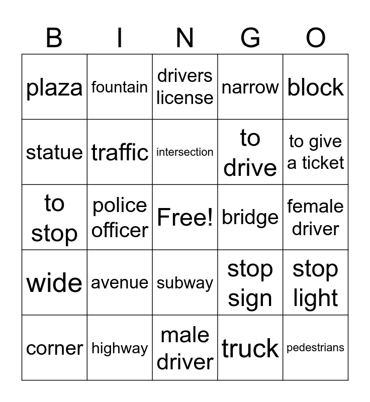 This bingo card has a free space and 24 words: avenue, highway, intersection, corner, block, plaza, statue, fountain, bridge, subway, to drive, to stop, stop sign, stop light, traffic, truck, female driver, drivers license, to give a ticket, police officer, pedestrians, wide, narrow and male driver.