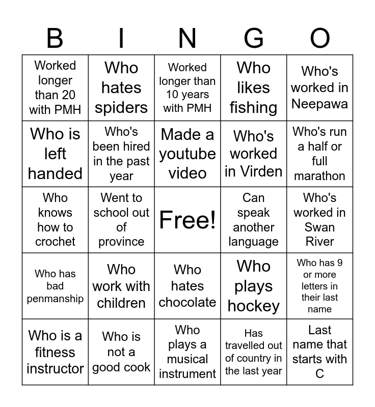 This bingo card has a free space and 29 words: Who is a fitness instructor, Who wears socks to bed, Went to school out of province, Has a dog, Worked longer than 20 with PMH, Worked longer than 10 years with PMH, Who's been hired in the past year, Who work with children, Can speak another language, Who is not a good cook, Who's worked in Swan River, Last name that starts with C, Who plays a musical instrument, Has travelled out of country in the last year, Who's run a half or full marathon, Worked longer than 15 years with PMH, Who hates chocolate, Who has bad penmanship, Who's worked in Neepawa, Who knows how to crochet, Who plays hockey, Born in June, Who's worked in Virden, Who is left handed, Who likes fishing, Who hates spiders, Who has 9 or more letters in their last name, Made a youtube video and Who doesn't like eating vegetables.