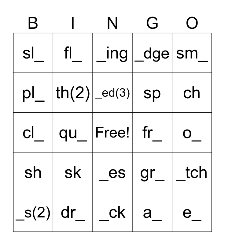 This bingo card has a free space and 24 words: sk, dr_, _ed(3), _s(2), sm_, sl_, pl_, fl_, fr_, _es, sp, cl_, gr_, _tch, th(2), a_, o_, _ing, ch, qu_, e_, sh, _dge and _ck.