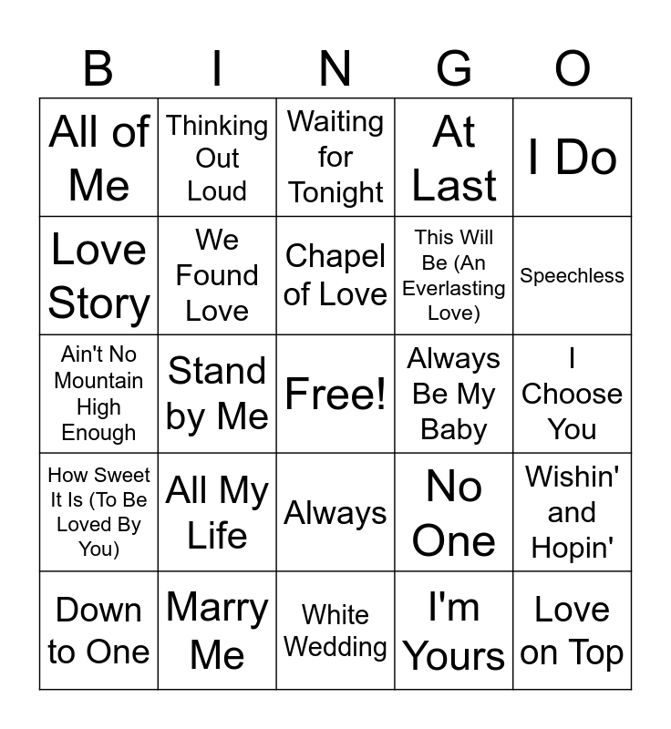 This bingo card has a free space and 29 words: Down to One, My Girl, Stand by Me, Signed, Sealed, Delivered (I'm Yours), All of Me, Waiting for Tonight, We Found Love, All My Life, Always Be My Baby, Marry Me, I Choose You, Love on Top, White Wedding, I'm Yours, Speechless, Only Wanna Be With You, Always, How Sweet It Is (To Be Loved By You), I Do, Ain't No Mountain High Enough, No One, Crazy Little Thing Called Love, This Will Be (An Everlasting Love), Love Story, At Last, Thinking Out Loud, Wishin' and Hopin', Chapel of Love and L-O-V-E.