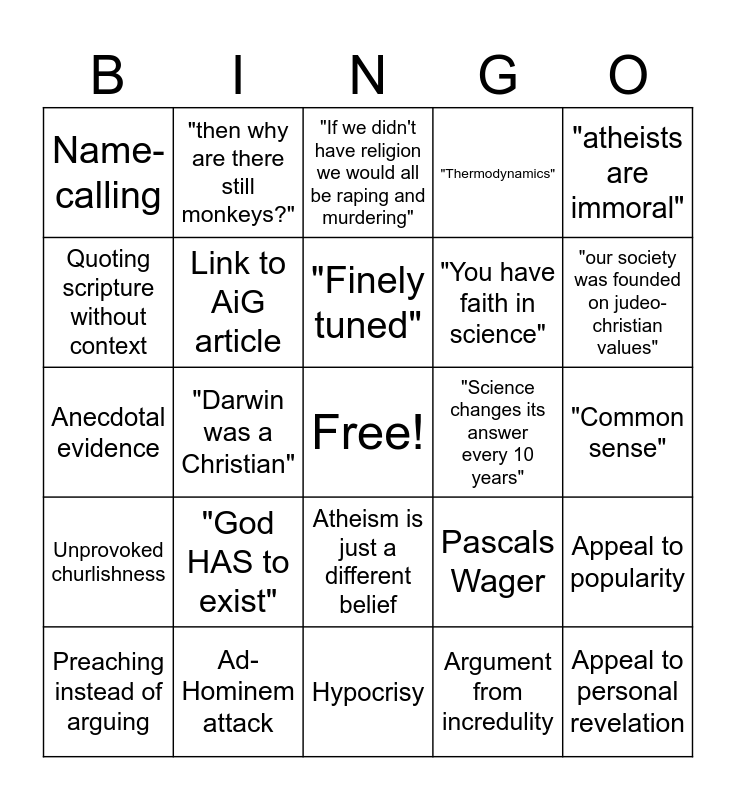 This bingo card has a free space and 24 words: "God HAS to exist", Ad-Hominem attack, "Finely tuned", Preaching instead of arguing, "atheists are immoral", Name-calling, Quoting scripture without context, "then why are there still monkeys?", "Science changes its answer every 10 years", Atheism is just a different belief, "You have faith in science", Anecdotal evidence, Pascals Wager, Appeal to popularity, Link to AiG article, Argument from incredulity, "Common sense", "If we didn't have religion we would all be raping and murdering", "our society was founded on judeo-christian values", "Darwin was a Christian", Appeal to personal revelation, Unprovoked churlishness, "Thermodynamics" and Hypocrisy.