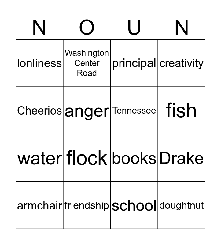This bingo card has a free space and 15 words: armchair, doughtnut, principal, lonliness, fish, Cheerios, flock, school, anger, water, Drake, creativity, Tennessee, Washington Center Road and friendship.