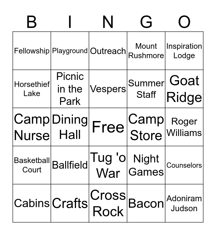This bingo card has a free space and 31 words: Cross Rock, Frog Rock, Dining Hall, Campfire, Fellowship, Outreach, Picnic in the Park, Night Games, Camp Store, Bacon, Roger Williams, Adoniram Judson, The Lake, Baldy, Goat Ridge, Slip 'n Slide, Counselors, Ballfield, Basketball Court, Tug 'o War, Inspiration Lodge, campjudson.org, Cabins, Playground, Summer Staff, Horsethief Lake, Mount Rushmore, Camp Nurse, Crafts, Vespers and Morning Bell.