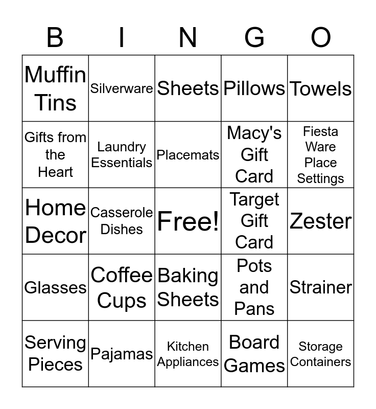 This bingo card has a free space and 24 words: Coffee Cups, Pajamas, Placemats, Serving Pieces, Towels, Muffin Tins, Gifts from the Heart, Silverware, Target Gift Card, Baking Sheets, Macy's Gift Card, Home Decor, Pots and Pans, Strainer, Laundry Essentials, Board Games, Zester, Sheets, Fiesta Ware Place Settings, Casserole Dishes, Storage Containers, Glasses, Pillows and Kitchen Appliances.