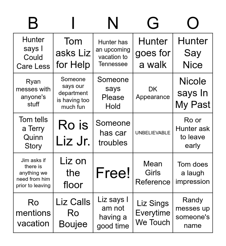 This bingo card has 26 words: Free!, Liz Sings Everytime We Touch, Someone says Please Hold, Liz Calls Ro Boujee, Hunter Say Nice, Hunter says I Could Care Less, Ryan messes with anyone's stuff, Tom asks Liz for Help, Ro or Hunter ask to leave early, Mean Girls Reference, DK Appearance, Tom tells a Terry Quinn Story, Tom does a laugh impression, Ro mentions vacation, Ro is Liz Jr., Tom says he's hungry before 11, Hunter goes for a walk, Jim asks if there is anything we need from him prior to leaving, Hunter has an upcoming vacation to Tennessee, Someone has car troubles, Nicole says In My Past, Liz says I am not having a good time, UNBELIEVABLE, Liz on the floor, Someone says our department is having too much fun and Randy messes up someone's name.