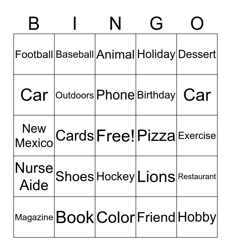 This bingo card has a free space and 24 words: Shoes, Book, Phone, Magazine, Dessert, Football, Car, Baseball, Pizza, Hockey, Birthday, New Mexico, Lions, Restaurant, Outdoors, Friend, Exercise, Animal, Car, Cards, Hobby, Nurse Aide, Holiday and Color.