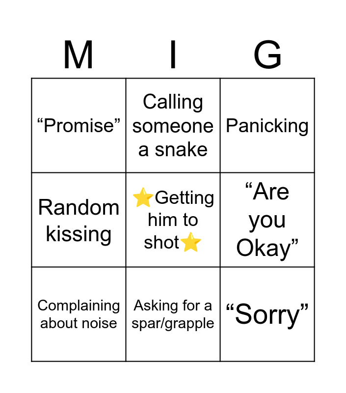 This bingo card has a free space and 8 words: “Are you Okay”, Panicking, Calling someone a snake, Complaining about noise, “Promise”, “Sorry”, Random kissing and Asking for a spar/grapple.
