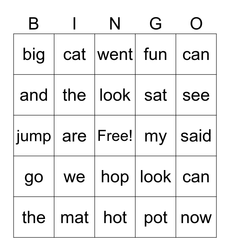 This bingo card has a free space and 24 words: we, mat, look, the, can, big, and, cat, my, hop, sat, jump, look, can, the, pot, said, went, see, are, now, go, fun and hot.