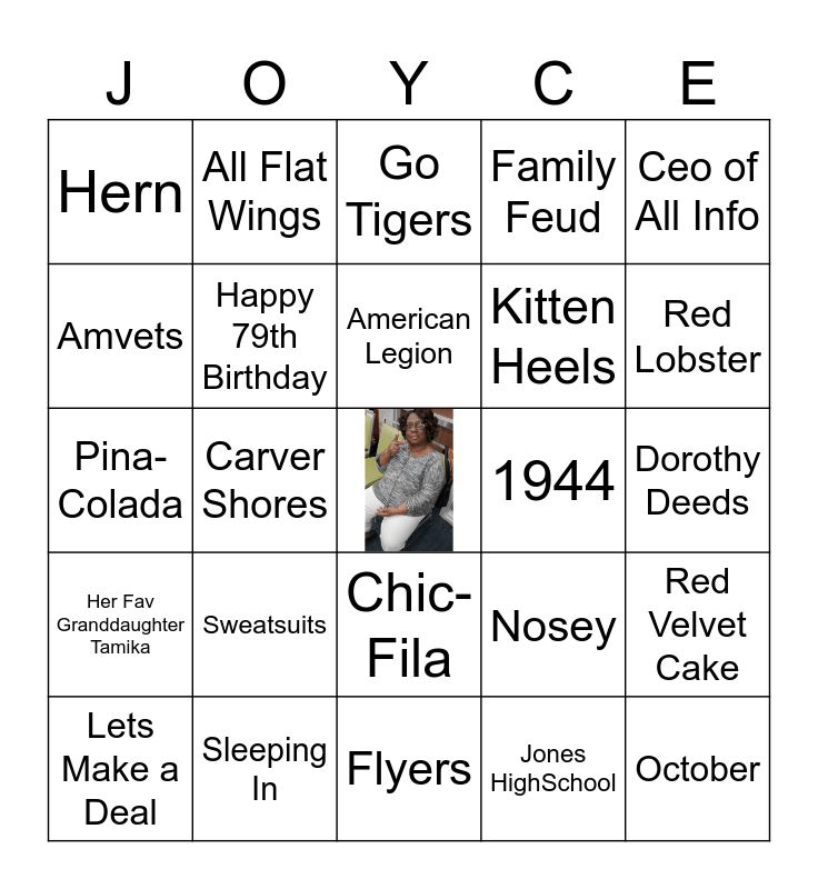 This bingo card has a free space and 44 words: The Price is Right, October, Pattie Labelle, Lets Make a Deal, Pajamas, Jones HighSchool, Go Tigers, Red Lobster, Ceo of All Info, Sleeping In, Family Feud, 1944, Chic-Fila, Sweatsuits, Crinkle Ponytail, Flyers, Netflix, Pina-Colada, Pecan Waffles, Red Lobster, All Flat Wings, Ribs, Waffle House, Hern, 79, Dorothy Deeds, Scorpio, Lakemann Gardens, Nosey, Her Fav Granddaughter Tamika, Piedmont St, Red Velvet Cake, General Hospital, Herbert Circle, Carver Shores, Peabody Hotel, Monte Carlo Car, Pistachio Cake, American Legion, Amvets, Kitten Heels, The Best Grandma/Mom Ever, Happy 79th Birthday and Girl you crazy.