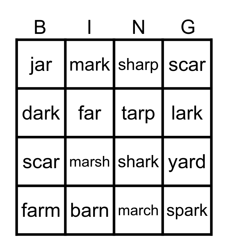 This bingo card has 16 words: barn, yard, sharp, jar, scar, mark, shark, march, dark, far, farm, scar, marsh, lark, tarp and spark.