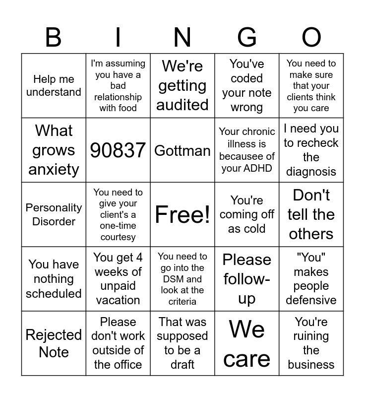 This bingo card has a free space and 24 words: You get 4 weeks of unpaid vacation, Please don't work outside of the office, Gottman, Rejected Note, You need to make sure that your clients think you care, Help me understand, What grows anxiety, I'm assuming you have a bad relationship with food, You're coming off as cold, You need to go into the DSM and look at the criteria, Your chronic illness is becausee of your ADHD, Personality Disorder, Please follow-up, "You" makes people defensive, 90837, We care, Don't tell the others, We're getting audited, I need you to recheck the diagnosis, You need to give your client's a one-time courtesy, You're ruining the business, You have nothing scheduled, You've coded your note wrong and That was supposed to be a draft.