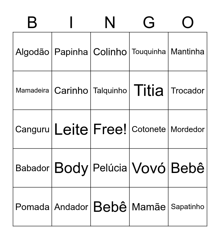 This bingo card has a free space and 31 words: Bebê, Banheira, Leite, Chocalho, Algodão, Colinho, Carinho, Vovó, Cotonete, Mamãe, Mordedor, Sapatinho, Chupeta, Lencinho, Trocador, Fralda, Bebê, Body, Babador, Pelúcia, Mantinha, Berço, Pomada, Papinha, Titia, Mamadeira, Touquinha, Canguru, Andador, Talquinho and Naninh.