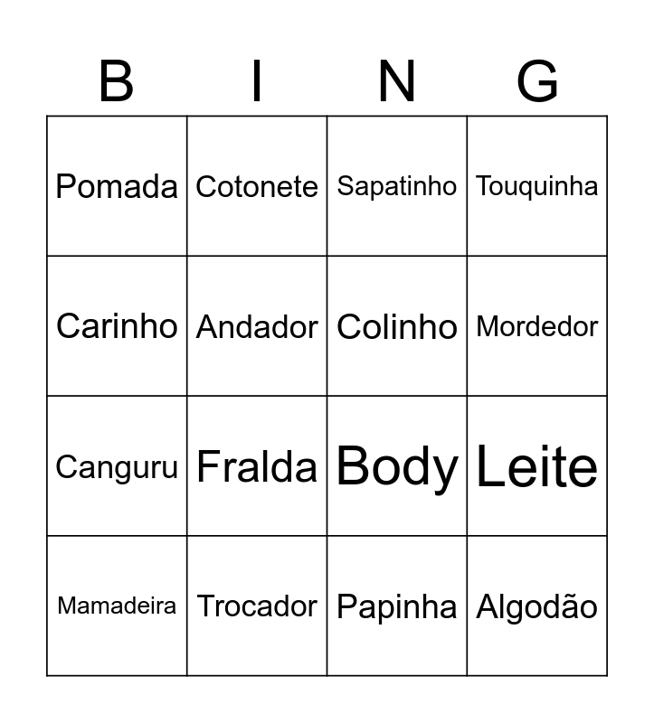 This bingo card has 33 words: Bebê, Banheira, Leite, Chocalho, Algodão, Colinho, Carinho, Vovó, Cotonete, Mamãe, Mordedor, Sapatinho, Chupeta, Lencinho, Trocador, Fralda, Bebê, Body, Babador, Pelúcia, Mantinha, Berço, Pomada, Papinha, Titia, Mamadeira, Touquinha, Canguru, Andador, Talquinho, Naninha, Gorro and Brinquedos.