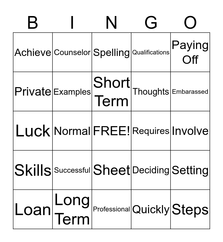 This bingo card has a free space and 24 words: Successful, Long Term, Short Term, Loan, Paying Off, Achieve, Private, Counselor, Requires, Sheet, Thoughts, Luck, Deciding, Setting, Examples, Quickly, Involve, Spelling, Embarassed, Normal, Steps, Skills, Qualifications and Professional.