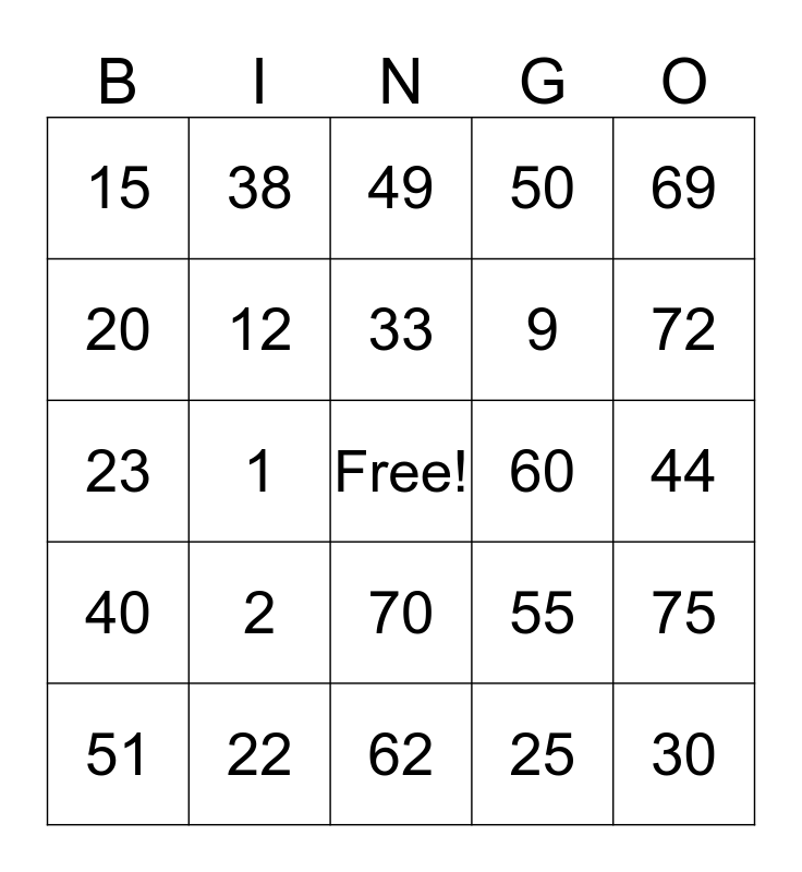 This bingo card has a free space and 24 words: 2, 22, 33, 51, 69, 15, 20, 38, 60, 70, 9, 23, 55, 75, 12, 25, 44, 49, 72, 1, 30, 40, 50 and 62.