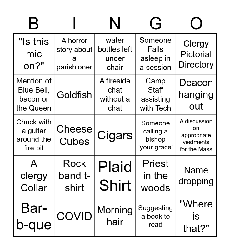This bingo card has 40 words: Malapropism From the mouth of the bishop, Chuck with a guitar around the fire pit, Bishop speaking spanish, Goldfish, COVID, Plaid Shirt, A fireside chat without a chat, A question that's more of a comment, Clergy Pictorial Directory, A clergy Collar, Cheese Cubes, Someone Falls asleep in a session, Cigars, A discussion on appropriate vestments for the Mass, Someone calling a bishop “your grace”, Rock band t-shirt, Speaker hawking book, "Is this mic on?", can you hear me?, water bottles left under chair, Name dropping, Suggesting a book to read, Camp Staff assisting with Tech, Mention of Blue Bell, bacon or the Queen, Movie reference, Canon Faulstich makes a correction, A maniple, non Aggie in overalls, "Where is that?", spelling mistake in a ppt slide, a priest in a cassock, Bar-b-que, Late night deep thoughts in a small group, Priest in the woods, Deacon hanging out, Morning hair, Boomers drinking coffee in the morning, An old EDOT story about a bishop, A horror story about a parishioner and Loud laughter.