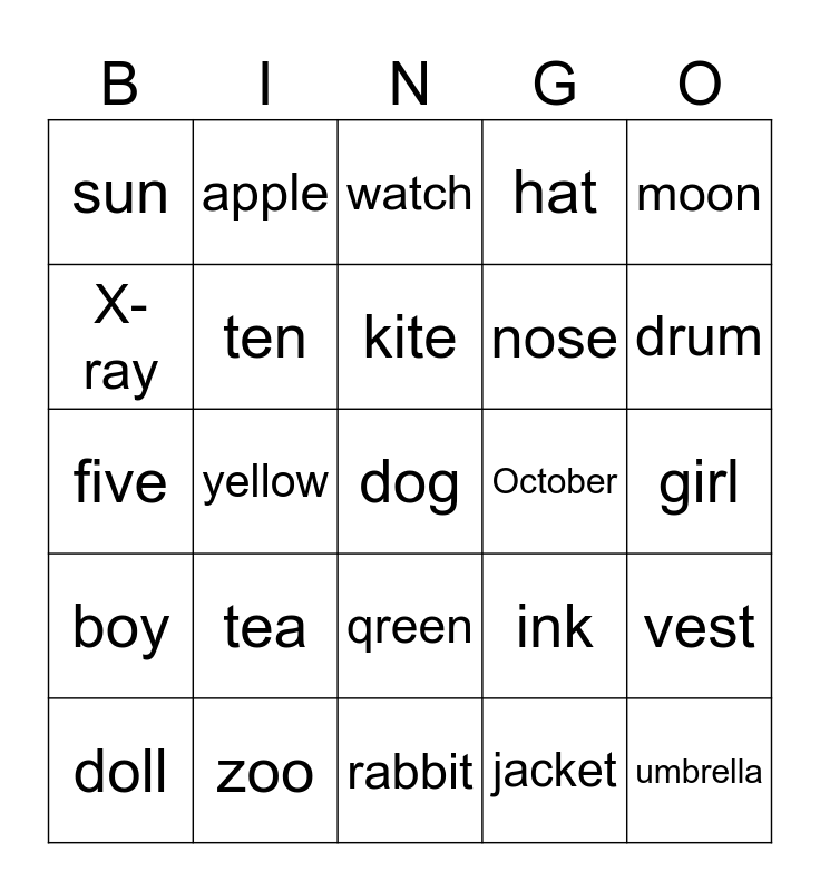 This bingo card has a free space and 24 words: tea, zoo, kite, doll, moon, sun, X-ray, apple, October, qreen, nose, five, ink, vest, ten, jacket, girl, watch, drum, yellow, umbrella, boy, hat and rabbit.