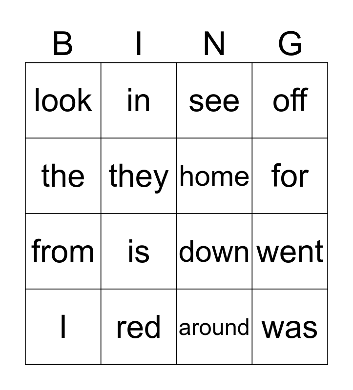 This bingo card has a free space and 15 words: I, was, see, look, for, the, is, around, they, from, went, off, home, in and red.