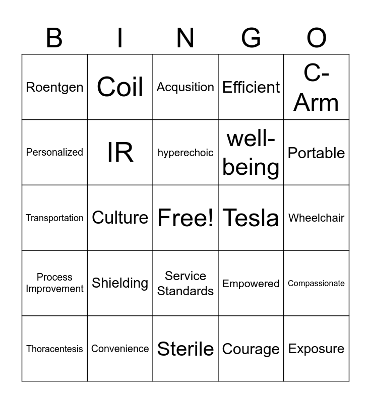 This bingo card has a free space and 79 words: Safe, XRAY, Acqusition, Pigg-O-Stat, Gantry, Magnetic, Shoulder, Portable, CXR, Attenuation, C-Spine, Tesla, Efficient, Roentgen, KUB, Personalized, Water's View, Shielding, Doppler, Wheelchair, Isotope, C-Arm, Transportation, hyperechoic, IR, PERQ, PACS, Caring, Radiology, Injector, Portable, KVP, Sterile, Isotope, Thoracentesis, Tesla, hypoechoic, Transducer, Sonography, Exposure, HIDA, ERCP, Femur, Bolus, UGI, Coil, ALARA, Safety, Accountable, Collaborative, Compassionate, Culture, Empowered, Focused, Innovative, Oriented, Pledge, Promise, Results, Service Standards, well-being, Nurture, Relationships, Diversity, Trust, Values, Recognize, Perspective, Quality, Process Improvement, Convenience, Collaboration, Community, Compassion, Credibility, Courage, Connect, Inspire and Engage.