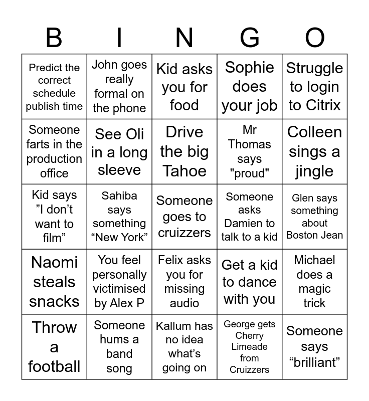 This bingo card has 37 words: Free!, Kid goes to hospital, Involved in crew member going to hospital, See Oli in a long sleeve, Michael does a magic trick, You feel personally victimised by Alex P, Drive the big Tahoe, Eat a piece of wild game (squirrel/deer), Struggle to login to Citrix, Dave wears shorts, Sahiba says something “New York”, Sophie does your job, Someone goes to cruizzers, Glen says something about Boston Jean, Someone farts in the production office, Naomi steals snacks, Richae steals snacks, Kid asks you for food, Felix asks you for missing audio, Someone asks Damien to talk to a kid, Predict the correct schedule publish time, Colleen sings a jingle, Throw a football, Kallum has no idea what’s going on, Kid drinks Gatorade, George gets Cherry Limeade from Cruizzers, John goes really formal on the phone, Glen says "that’s buff", Jess says "Legend", Dave wears trousers, Someone goes to Walmart, Someone hums a band song, Kid says ”I don’t want to film”, Someone says “brilliant”, Get a kid to dance with you, Mr Thomas says "proud" and Someone goes missing.