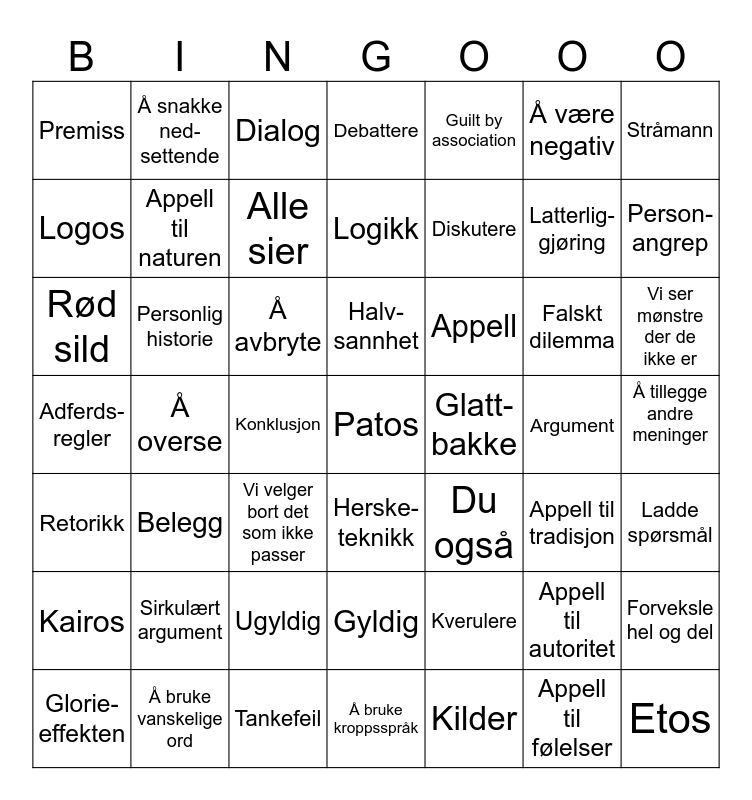 This bingo card has a free space and 48 words: Kverulere, Latterlig-gjøring, Å bruke kroppsspråk, Å overse, Å avbryte, Å tillegge andre meninger, Å snakke ned- settende, Å bruke vanskelige ord, Å være negativ, Herske- teknikk, Stråmann, Debattere, Falskt dilemma, Appell, Kairos, Argument, Logos, Person- angrep, Appell til autoritet, Guilt by association, Diskutere, Konklusjon, Premiss, Appell til naturen, Forveksle hel og del, Alle sier, Vi ser mønstre der de ikke er, Glorie- effekten, Halv- sannhet, Personlig historie, Appell til følelser, Glatt-bakke, Ladde spørsmål, Sirkulært argument, Adferds- regler, Du også, Appell til tradisjon, Rød sild, Vi velger bort det som ikke passer, Ugyldig, Retorikk, Etos, Dialog, Tankefeil, Logikk, Gyldig, Belegg and Kilder.