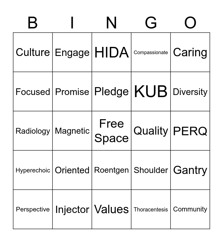 This bingo card has a free space and 79 words: Sonography, Exposure, HIDA, ERCP, Femur, Bolus, UGI, Coil, ALARA, Safety, Accountable, Collaborative, Compassionate, Culture, Empowered, Focused, Innovative, Oriented, IR, PERQ, PACS, Caring, Radiology, Pledge, Promise, Results, Service Standards, Well-being, Nurture, Relationships, Diversity, Trust, Values, Recognize, Perspective, Quality, Process Improvement, Convenience, Collaboration, Community, Compassion, Credibility, Courage, Connect, Inspire, Engage, Safe, XRAY, Acqusition, Pigg-O-Stat, Gantry, Magnetic, Shoulder, Portable, CXR, Attenuation, C-Spine, Tesla, Efficient, Roentgen, KUB, Personalized, Water's View, Shielding, Doppler, Wheelchair, Isotope, C-Arm, Transportation, Hyperechoic, Injector, Portable, KVP, Sterile, Isotope, Thoracentesis, Tesla, Hypoechoic and Transducer.
