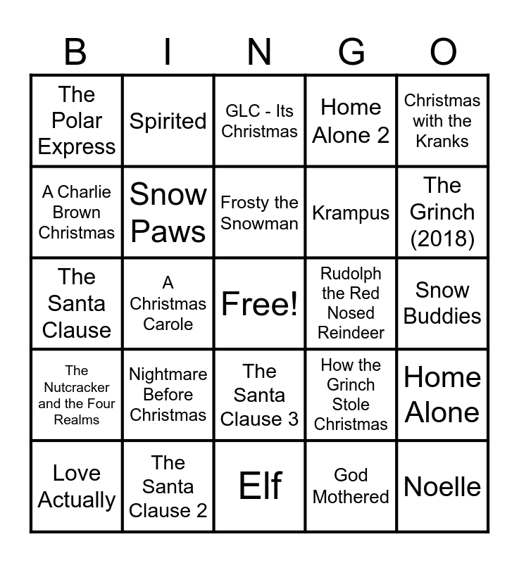 This bingo card has a free space and 24 words: Love Actually, Nightmare Before Christmas, Frosty the Snowman, God Mothered, Christmas with the Kranks, The Polar Express, Spirited, GLC - Its Christmas, Rudolph the Red Nosed Reindeer, Snow Buddies, The Santa Clause, Snow Paws, How the Grinch Stole Christmas, Home Alone, A Charlie Brown Christmas, The Santa Clause 2, Elf, Home Alone 2, The Grinch (2018), The Nutcracker and the Four Realms, A Christmas Carole, The Santa Clause 3, Krampus and Noelle.