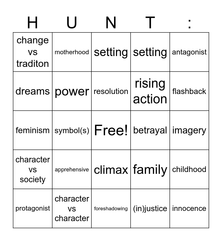 This bingo card has a free space and 24 words: apprehensive, character vs character, resolution, protagonist, antagonist, change vs traditon, dreams, motherhood, betrayal, climax, rising action, feminism, family, childhood, power, (in)justice, imagery, setting, flashback, symbol(s), innocence, character vs society, setting and foreshadowing.