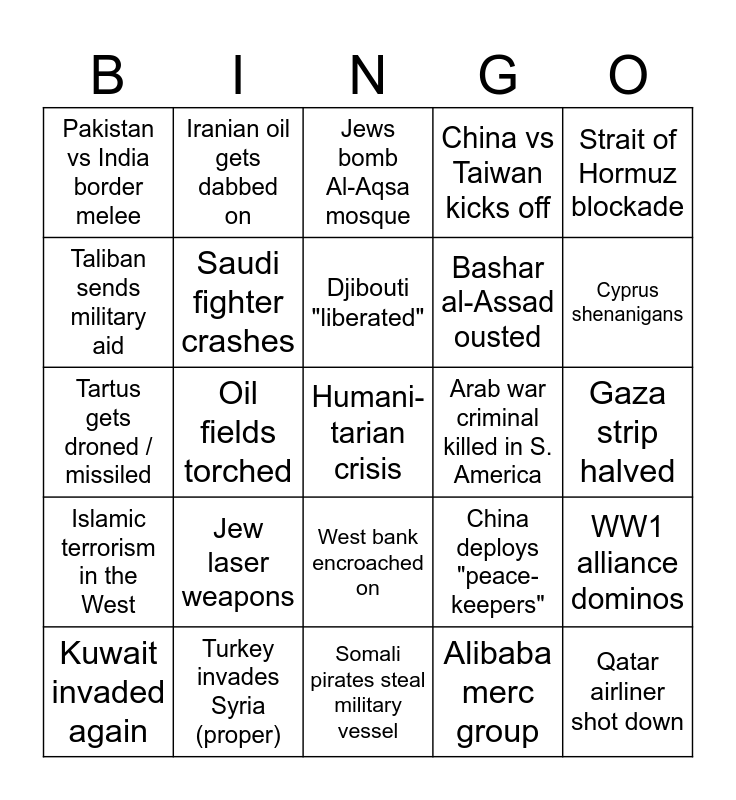 This bingo card has a free space and 24 words: Jew laser weapons, Turkey invades Syria (proper), Djibouti "liberated", Kuwait invaded again, Strait of Hormuz blockade, Pakistan vs India border melee, Taliban sends military aid, Iranian oil gets dabbed on, Arab war criminal killed in S. America, West bank encroached on, Bashar al-Assad ousted, Tartus gets droned / missiled, China deploys "peace-keepers", WW1 alliance dominos, Saudi fighter crashes, Alibaba merc group, Gaza strip halved, Jews bomb Al-Aqsa mosque, Cyprus shenanigans, Oil fields torched, Qatar airliner shot down, Islamic terrorism in the West, China vs Taiwan kicks off and Somali pirates steal military vessel.