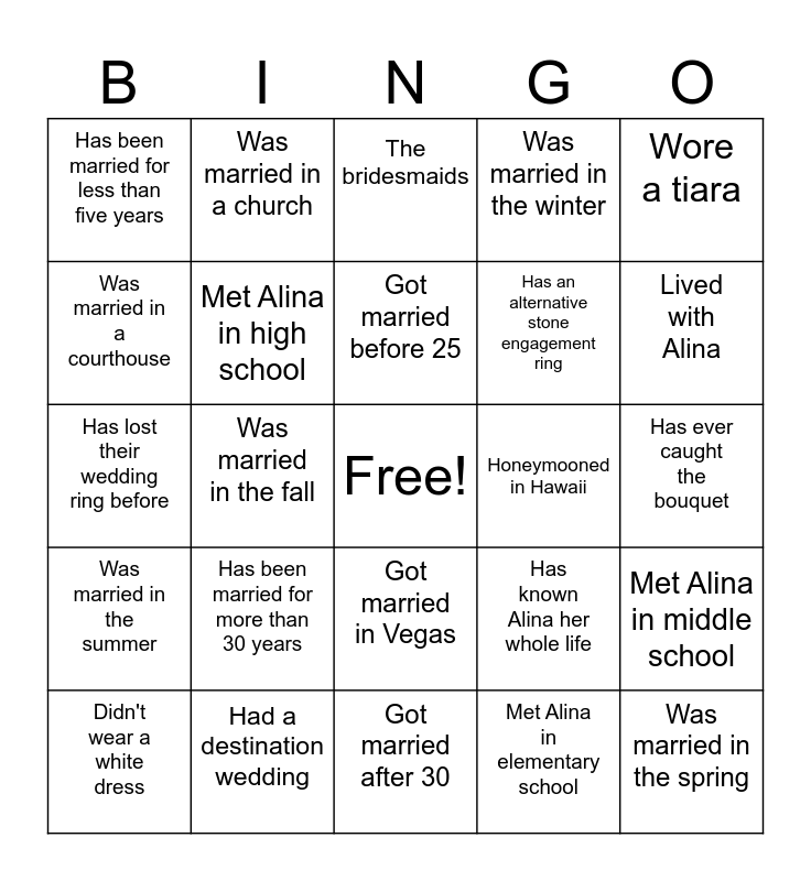 This bingo card has a free space and 24 words: Has been married for more than 30 years, Had a destination wedding, Got married before 25, Didn't wear a white dress, Wore a tiara, Has been married for less than five years, Was married in a courthouse, Was married in a church, Honeymooned in Hawaii, Got married in Vegas, Has an alternative stone engagement ring, Has lost their wedding ring before, Has known Alina her whole life, Met Alina in middle school, Met Alina in high school, Met Alina in elementary school, Has ever caught the bouquet, The bridesmaids, Lived with Alina, Was married in the fall, Was married in the spring, Was married in the summer, Was married in the winter and Got married after 30.