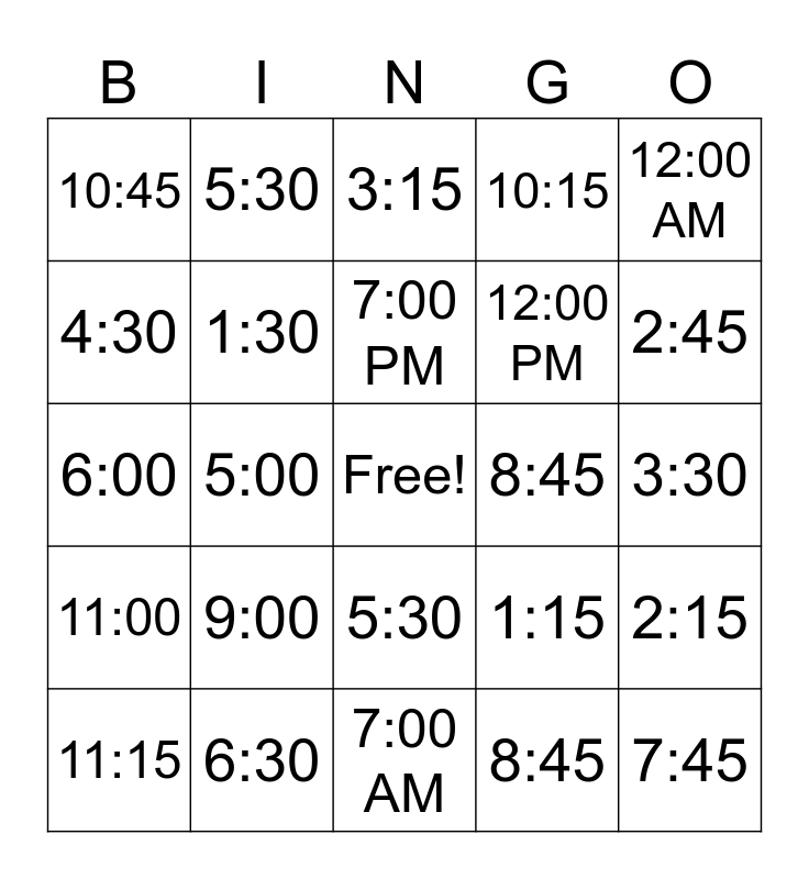This bingo card has a free space and 24 words: 9:00, 6:30, 7:00 PM, 11:15, 12:00 AM, 10:45, 4:30, 5:30, 8:45, 5:30, 12:00 PM, 6:00, 1:15, 2:15, 1:30, 8:45, 3:30, 3:15, 2:45, 5:00, 7:45, 11:00, 10:15 and 7:00 AM.