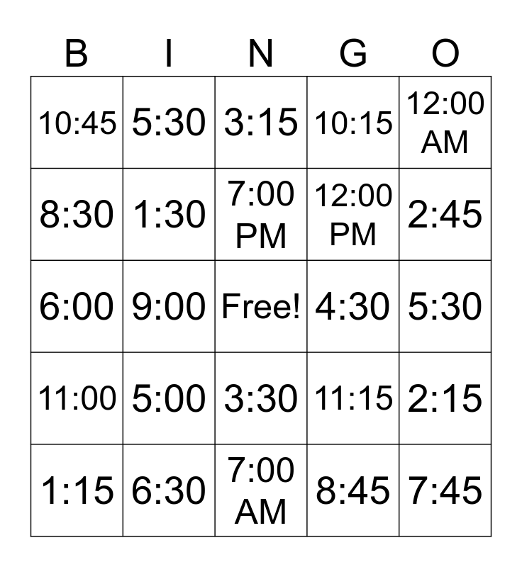 This bingo card has a free space and 24 words: 5:00, 6:30, 7:00 PM, 1:15, 12:00 AM, 10:45, 8:30, 5:30, 4:30, 3:30, 12:00 PM, 6:00, 11:15, 2:15, 1:30, 8:45, 5:30, 3:15, 2:45, 9:00, 7:45, 11:00, 10:15 and 7:00 AM.