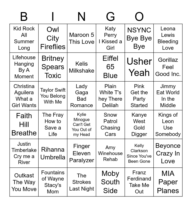 This bingo card has 52 words: Santana Smooth, Christina Aguilera What a Girl Wants, Black Eyed Peas I Gotta Feeling, Kanye West Gold Digger, Pink Get the Party Started, Moby South Side, Owl City Fireflies, My Chemical Romance The Black Parade, Leona Lewis Bleeding Love, Franz Ferdinand Take Me Out, Lifehouse Hanging By A Moment, Fountains of Wayne Stacy's Mom, The Fray How to Save a Life, Faith Hill Breathe, Shakira Whenever, Wherever, Outkast The Way You Move, Britney Spears Toxic, Taylor Swift You Belong With Me, Nickelback You Remind Me, NSYNC Bye Bye Bye, Gorillaz Feel Good Inc., Kings of Leon Use Somebody, Kid Rock All Summer Long, Kelis Milkshake, Christina Aguilera Beautiful, Justin Timberlake Cry me a River, Amy Winehouse Rehab, Train Drops of Jupiter, Eiffel 65 Blue, Finger Eleven Paralyzer, Miley Cyrus Party in the USA, Katy Perry I Kissed a Girl, White Stripes Seven Nation Army, Coldplay Clocks, Kelly Clarkson Since You've Been Gone, Maroon 5 This Love, Snow Patrol Chasing Cars, The Strokes Last Night, MIA Paper Planes, Avril Lavigne Complicated, Gnarls Barkley Crazy, Lady Gaga Bad Romance, Plain White T's hey There Delilah, U2 Beautiful Day, Jimmy Eat World In the Middle, Rihanna Umbrella, Beyonce Crazy In Love, Usher Yeah, Eminem Lose Yourself, The Killers Mr.Brightside, Kylie Minogue Can't Get You Out of my Head and Daft Punk One More Time.