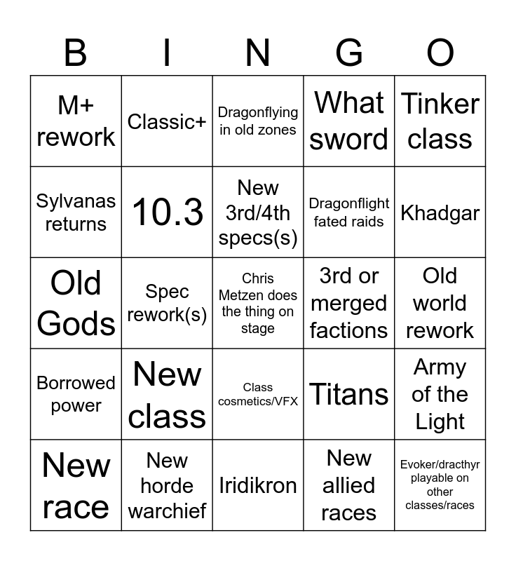 This bingo card has a free space and 24 words: New race, New class, New 3rd/4th specs(s), New allied races, Tinker class, M+ rework, Classic+, Dragonflying in old zones, 3rd or merged factions, Old world rework, Old Gods, 10.3, Titans, Army of the Light, Sylvanas returns, New horde warchief, Iridikron, What sword, Khadgar, Borrowed power, Spec rework(s), Class cosmetics/VFX, Dragonflight fated raids and Evoker/dracthyr playable on other classes/races.