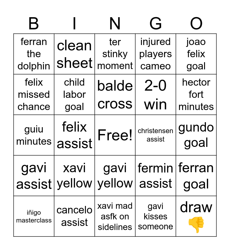 This bingo card has a free space and 24 words: xavi yellow, cancelo assist, balde cross, iñigo masterclass, joao felix goal, ferran the dolphin, felix missed chance, clean sheet, christensen assist, gavi yellow, 2-0 win, guiu minutes, fermin assist, ferran goal, child labor goal, gavi kisses someone, gundo goal, ter stinky moment, hector fort minutes, felix assist, draw 👎, gavi assist, injured players cameo and xavi mad asfk on sidelines.