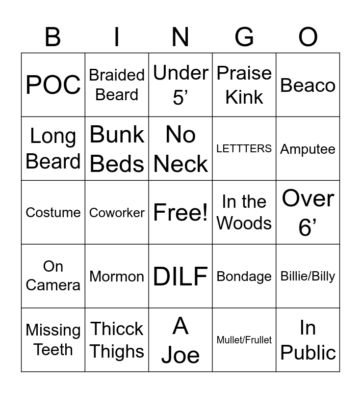 This bingo card has a free space and 24 words: Mormon, Thicck Thighs, No Neck, Missing Teeth, Beaco, POC, Long Beard, Braided Beard, In the Woods, DILF, LETTTERS, Costume, Bondage, Billie/Billy, Bunk Beds, Mullet/Frullet, Over 6’, Under 5’, Amputee, Coworker, In Public, On Camera, Praise Kink and A Joe.