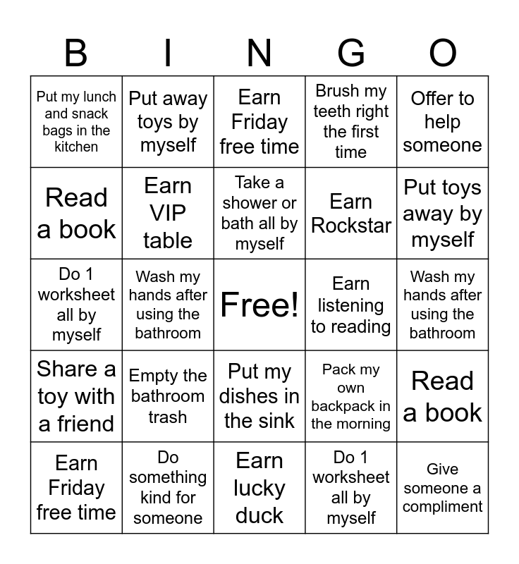 This bingo card has a free space and 24 words: Earn Friday free time, Empty the bathroom trash, Take a shower or bath all by myself, Do 1 worksheet all by myself, Offer to help someone, Put my lunch and snack bags in the kitchen, Put away toys by myself, Earn Friday free time, Earn listening to reading, Wash my hands after using the bathroom, Do 1 worksheet all by myself, Earn VIP table, Pack my own backpack in the morning, Read a book, Read a book, Do something kind for someone, Earn lucky duck, Brush my teeth right the first time, Put toys away by myself, Share a toy with a friend, Wash my hands after using the bathroom, Put my dishes in the sink, Earn Rockstar and Give someone a compliment.