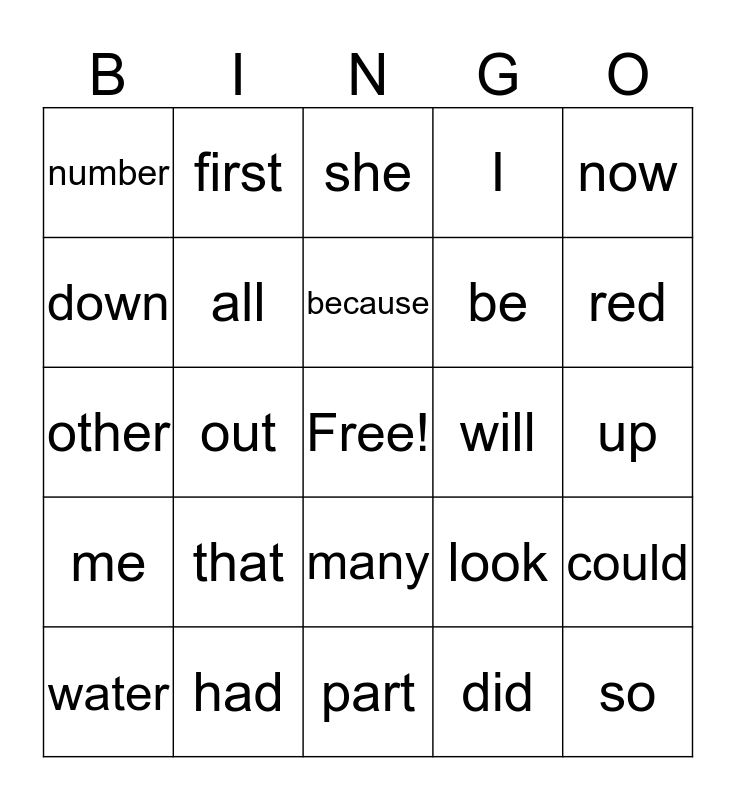 This bingo card has a free space and 24 words: that, had, because, water, now, number, down, first, will, many, be, other, look, could, all, did, up, she, red, out, so, me, I and part.